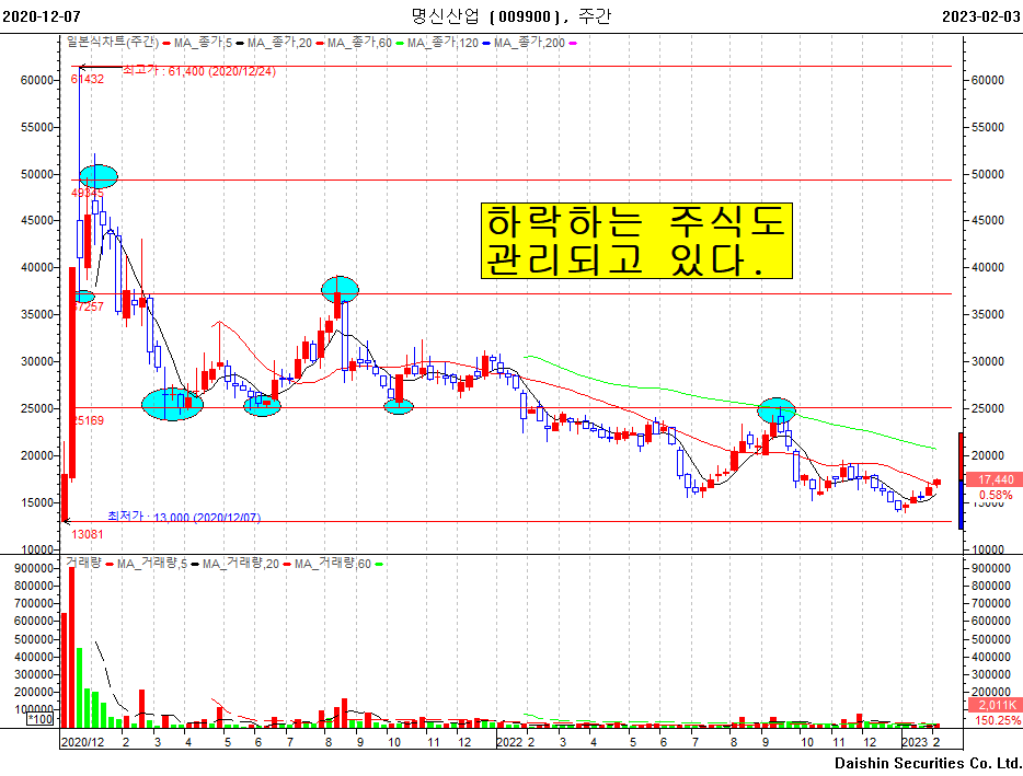 명신산업 주간차트를 보면 잘 관리되고 있음을 알 수 있습니다. 파란 동그라미 친 부분들이 주요 가격선을 의미하며 지지, 저항을 확실히 보여주고 있기 때문입니다.